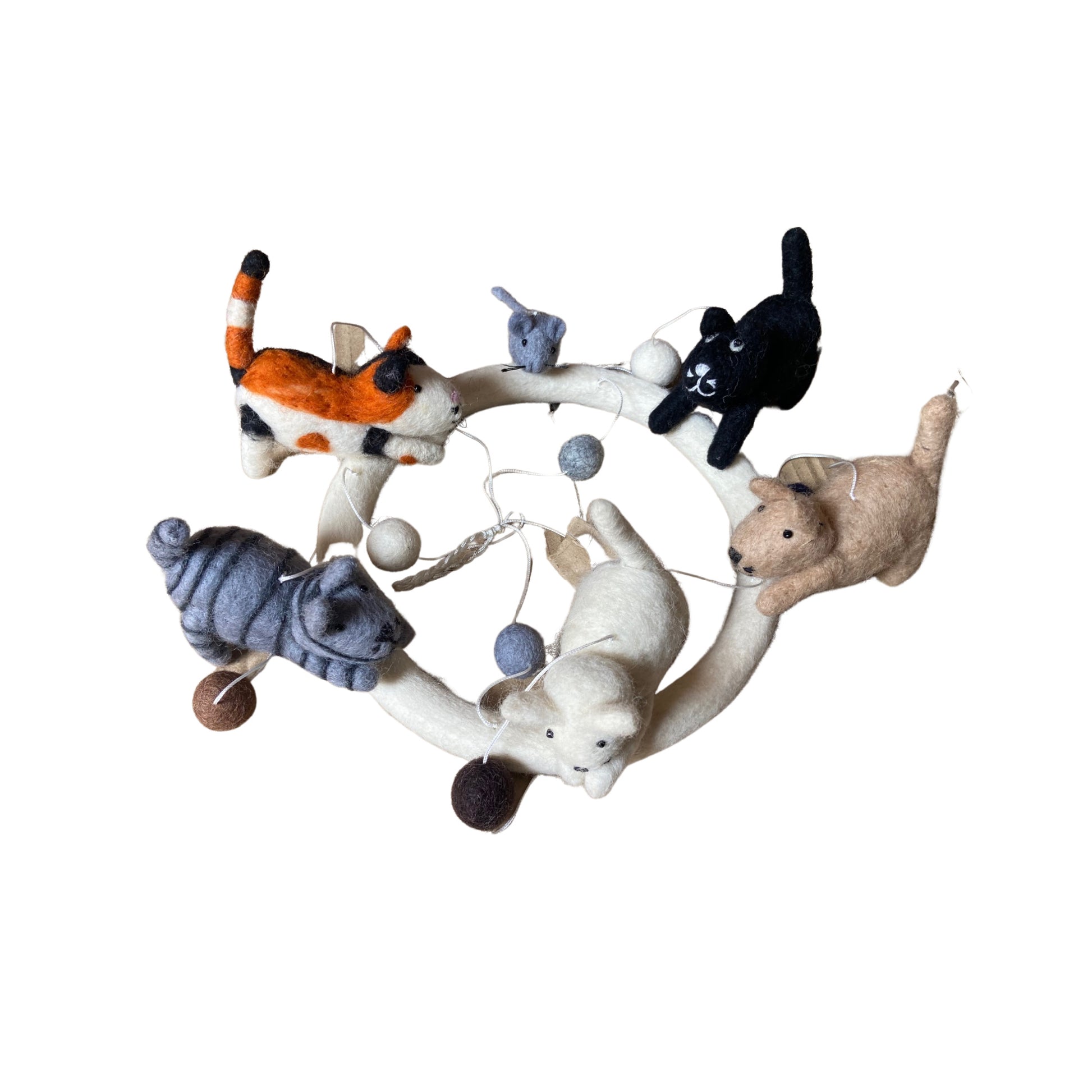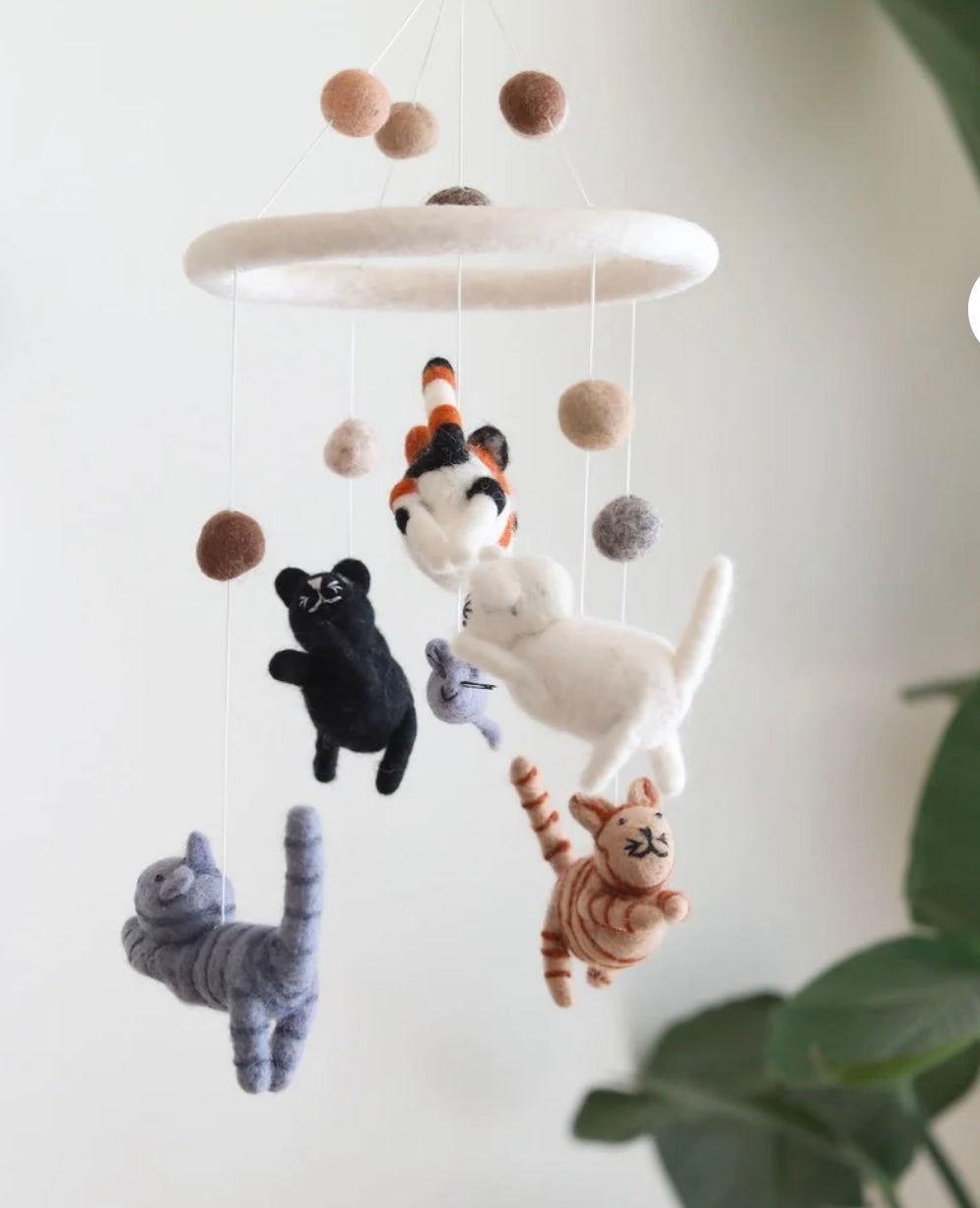 This adorable mobile is the perfect addition for any cat lover. Will create an adorable atmosphere in any rooom. Comes with 5 pussy cats and a cheeky mouse.