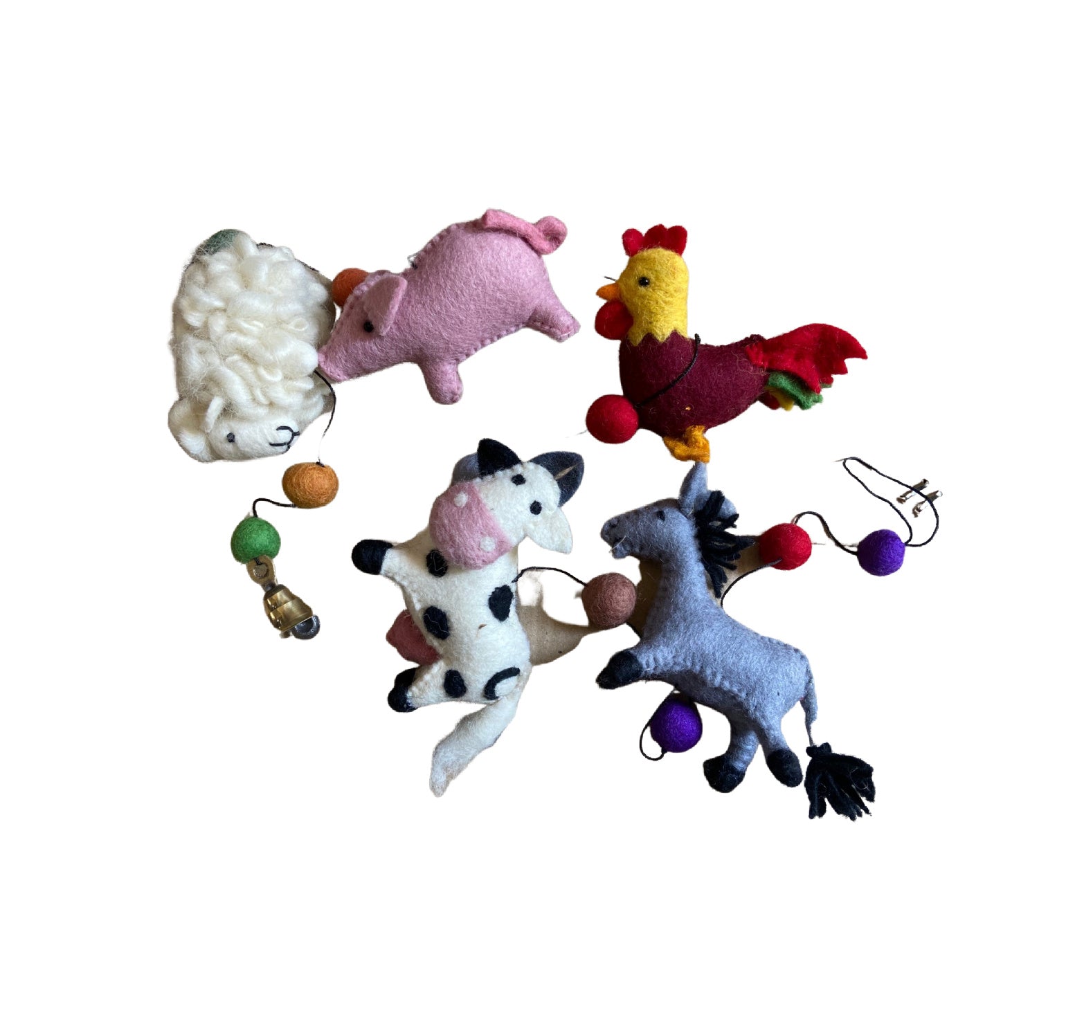 This adorable hanging comes with a zebra, rooster, pig, sheep, cow and donkey, with a bell on the end.