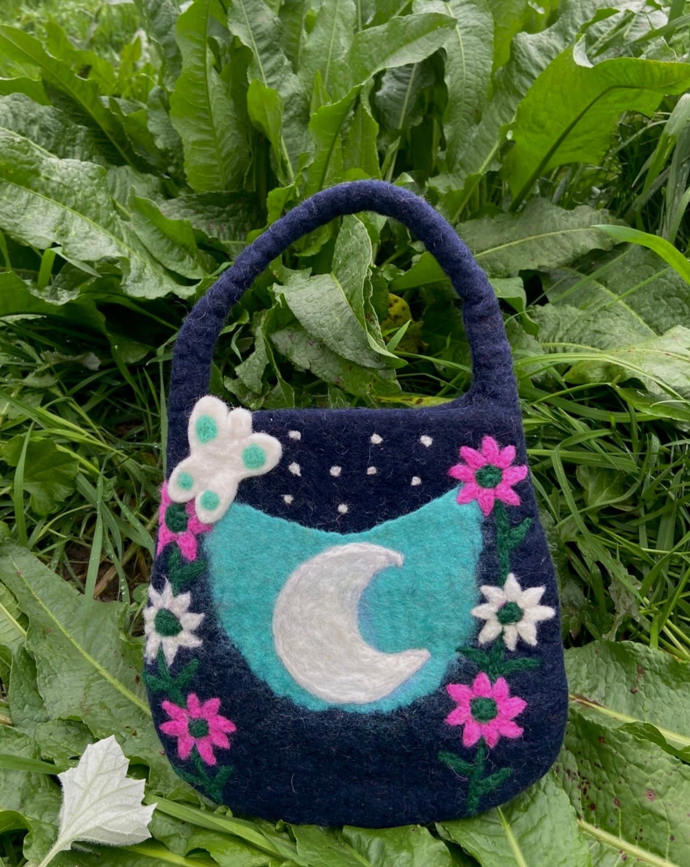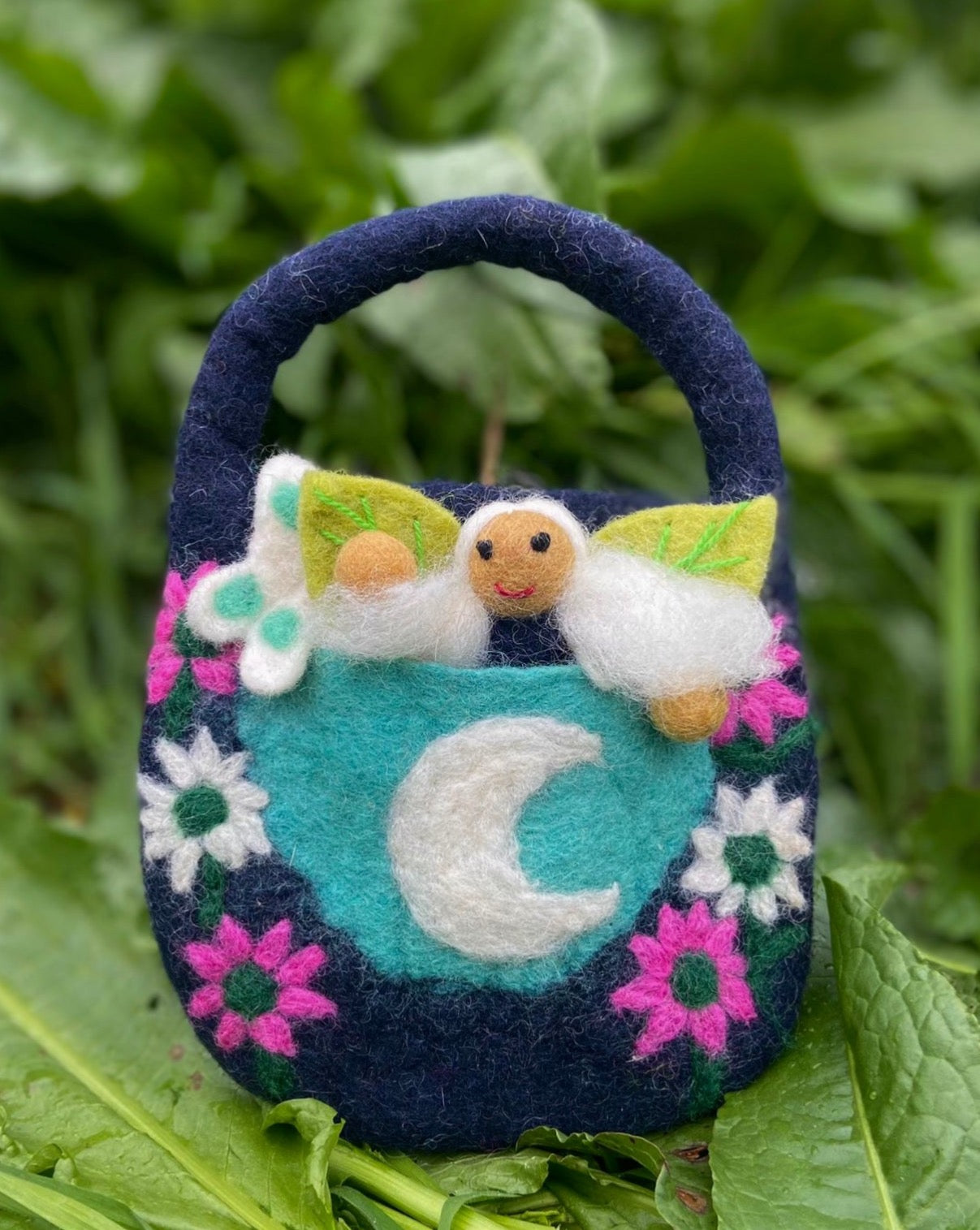 This little Luna bag comes with its very own Luna faery in its front pocket, it is adorned wit a Luna moth, blooming moon flowers and a crescent moon. The bag itself has a pocket in the front and a lined inside that shuts with a zipper.