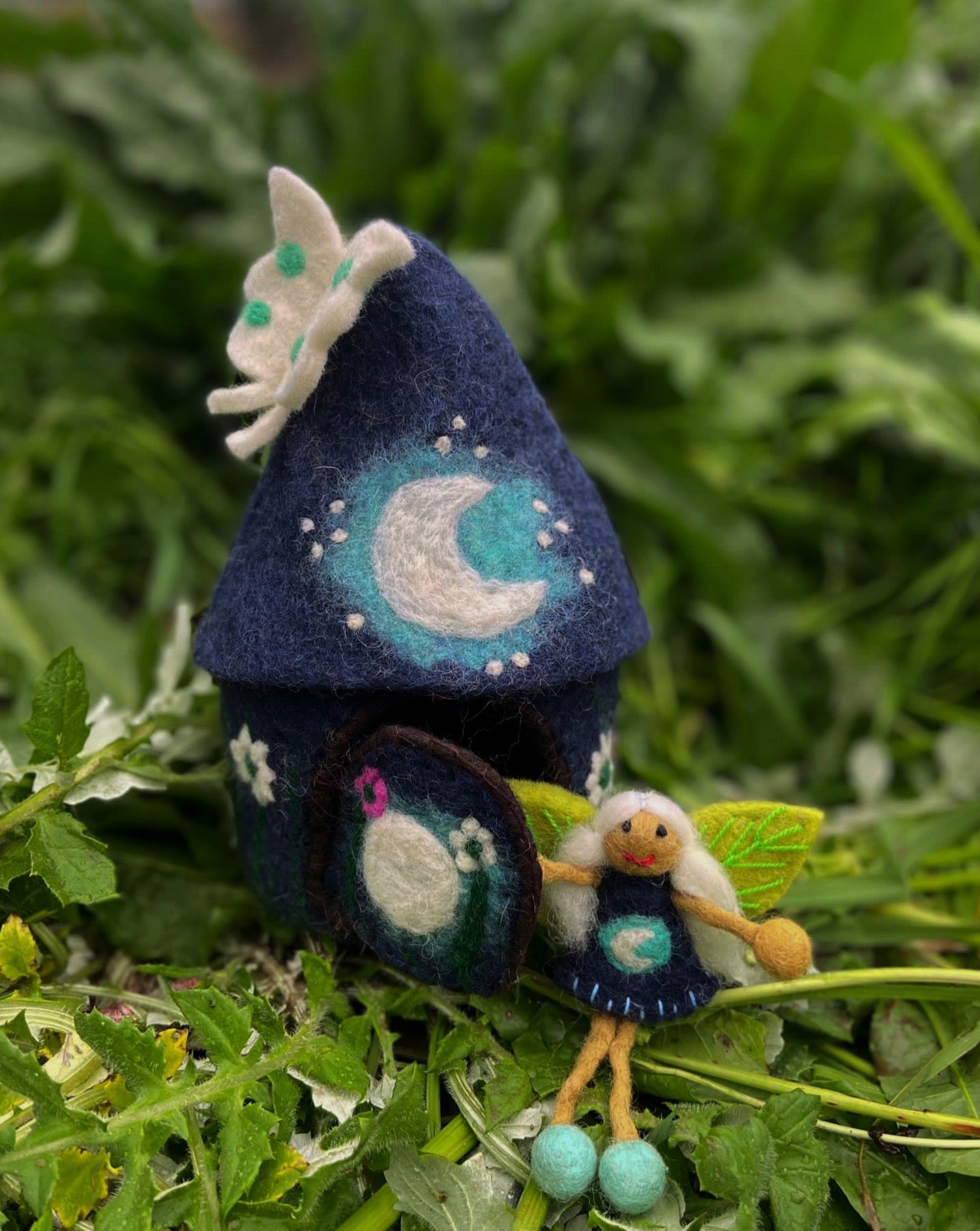 When the waxing moon rises in the sky, its time for tired dancing feet to find a soft place to rest before the sun rises. This is the smaller size of the Luna faery homes, at aprox 25cm high. Adorned with a beautiful crescent moon, a Luna moth, blooming moon flowers and a door tat opens and closes. It’s the perfect resting place for our small faeries when playtime is over. Please note that the faery s not included. The faery is available be purchased separately on this site.