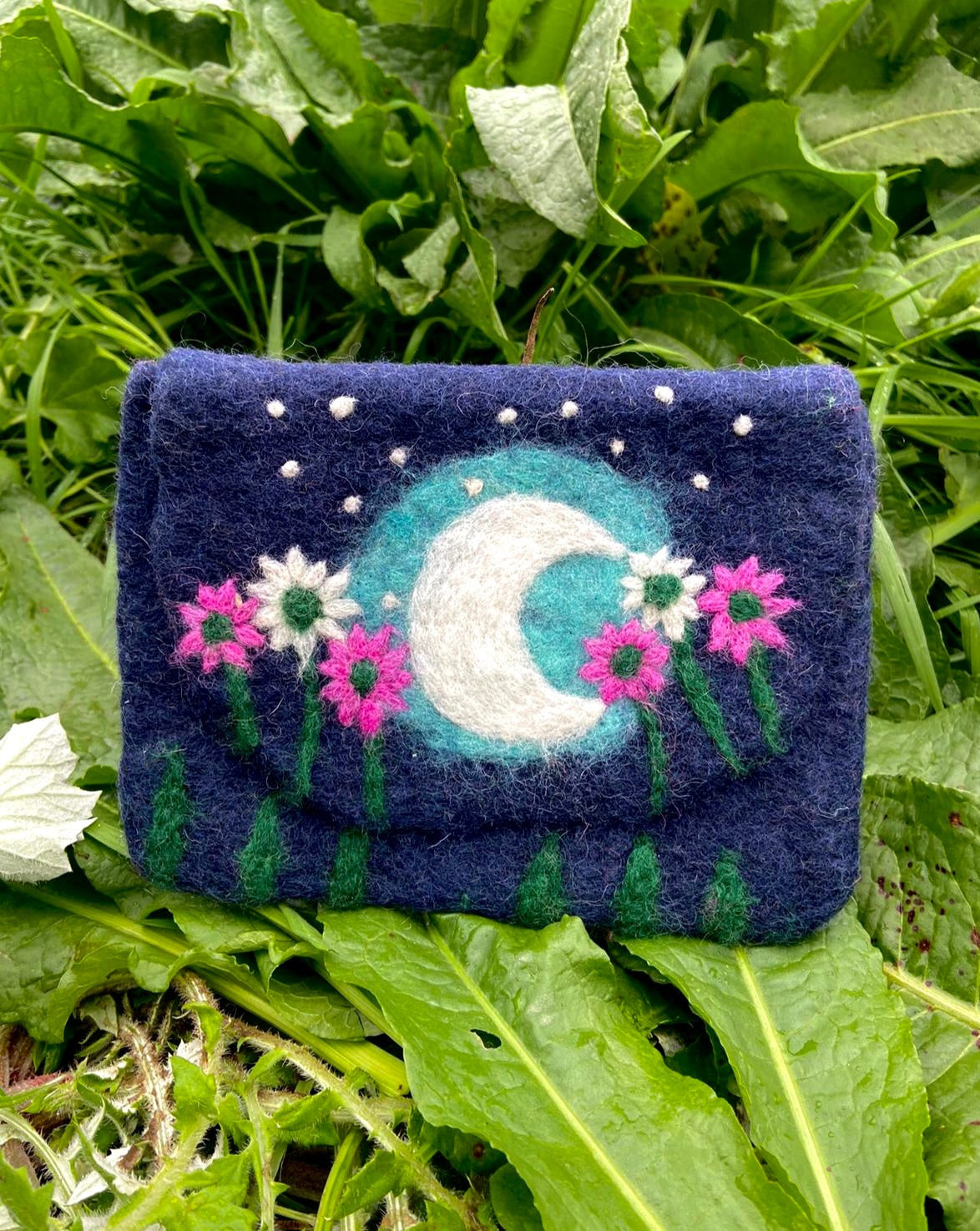 Designed by the magical Luna faeries this purse is adorned with blooming moon flowers and a magical crescent moon and twinkling stars. It is lined inside and shuts with a zipper.