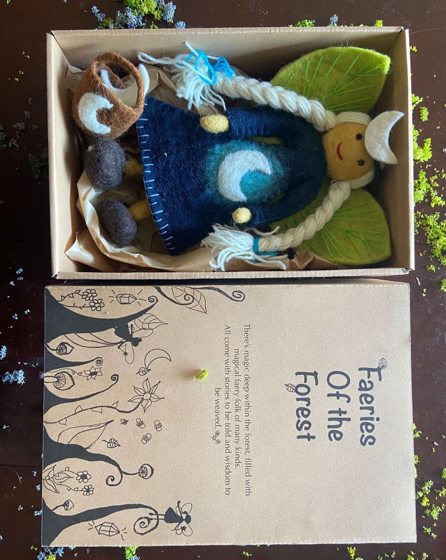 Deep in the forest lives a very magical faery called Luna, she is the forest faery of the moon, se holds a magical basket that is filled with crescent moons, and is here to teach her wisdom of moon magick! She is aprox 30cm tall and come in her very own faeries of the forest box.
