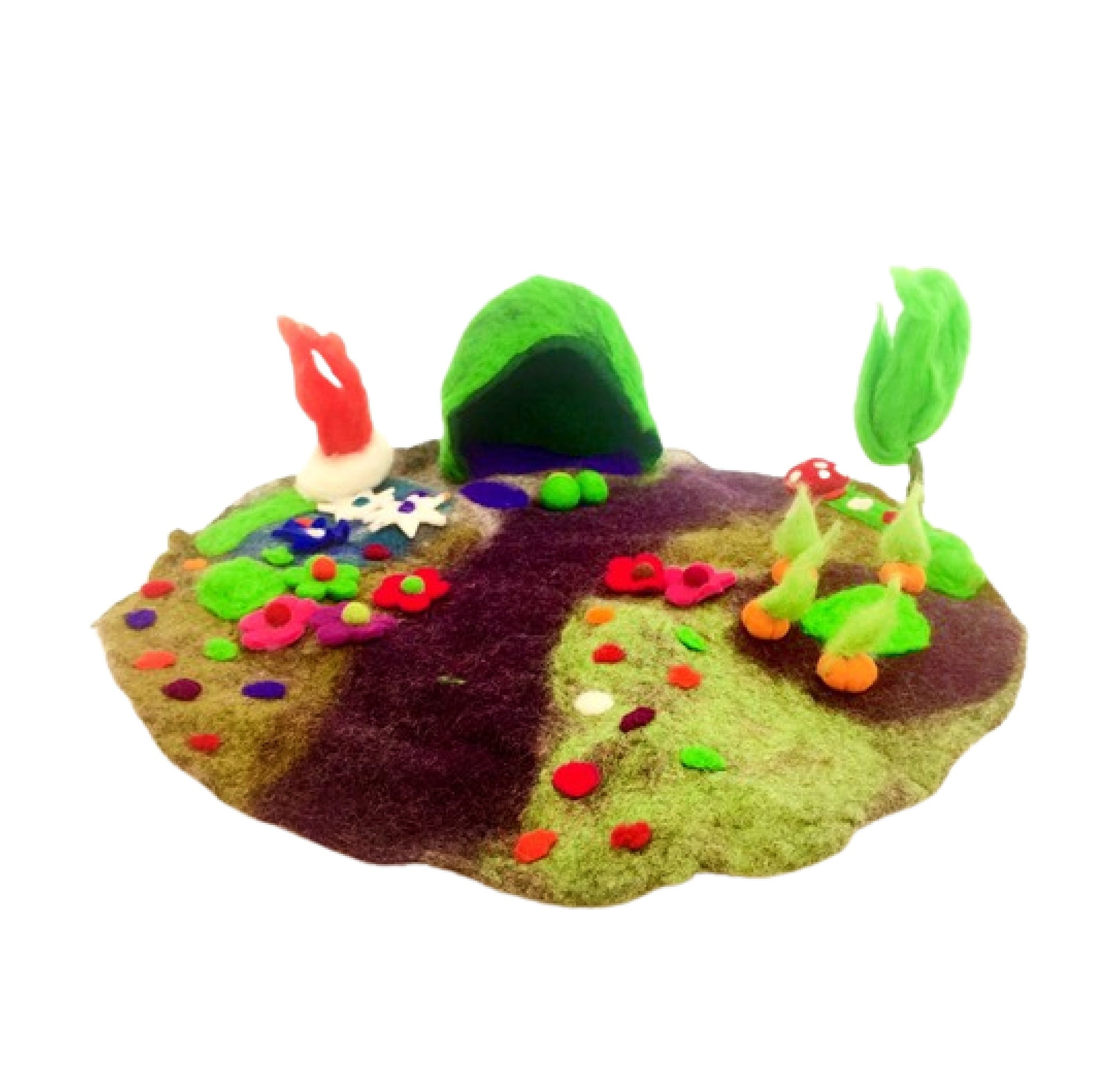 This magical mat comes with a felt cave, a camp fire, a pumpkin patch a trippy tree a magical river and wild flowers. This play mat is the perfect open ended play scape and works perfectly with all our elves, faeries and faery homes.