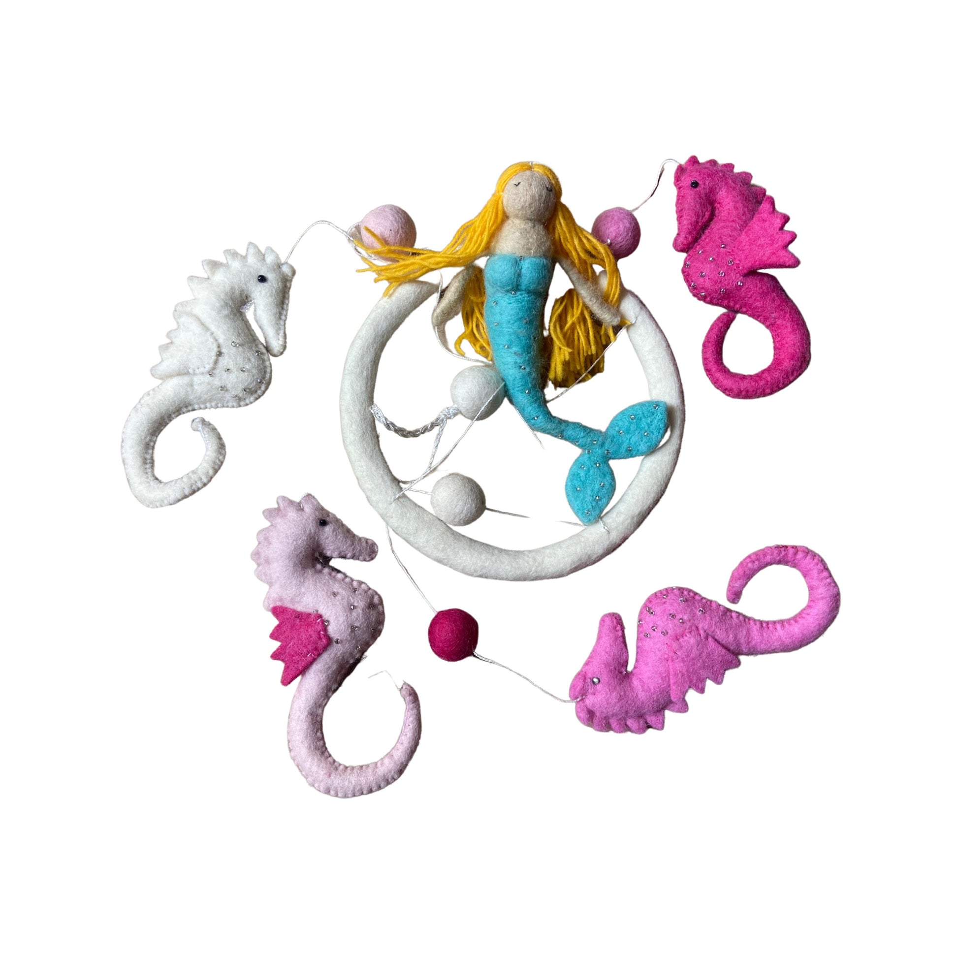 Bring a touch of ocean magic to any room with this playful mermaid and seahorse mobile. Delicately crafted, it gently spins to enchant little ones and spark their imagination. Perfect for nurseries or as a whimsical decorative accent, it adds a splash of underwater charm that delights both kids and adults alike.