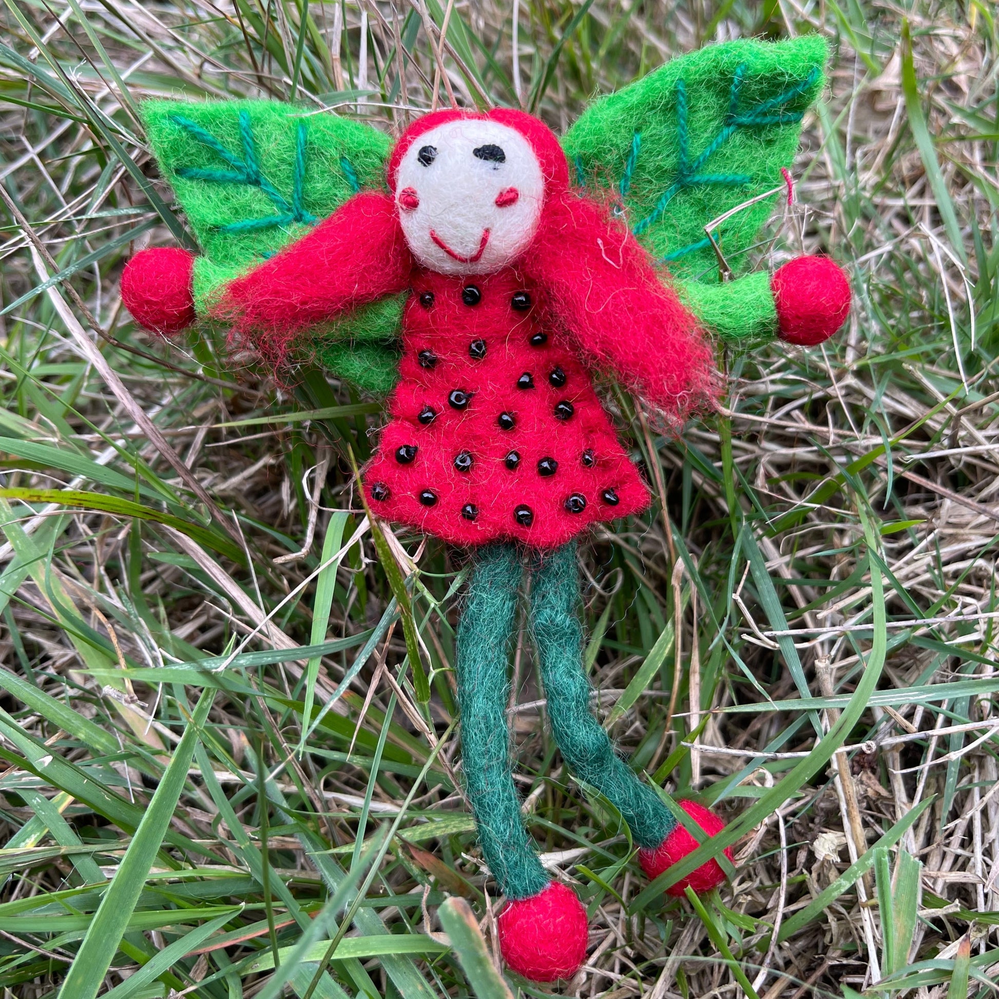 Miss strawberry has a red dress with stitched black beads, she has red hair and magical green leaf faery wings all designed by us! She is aprox 13cm long