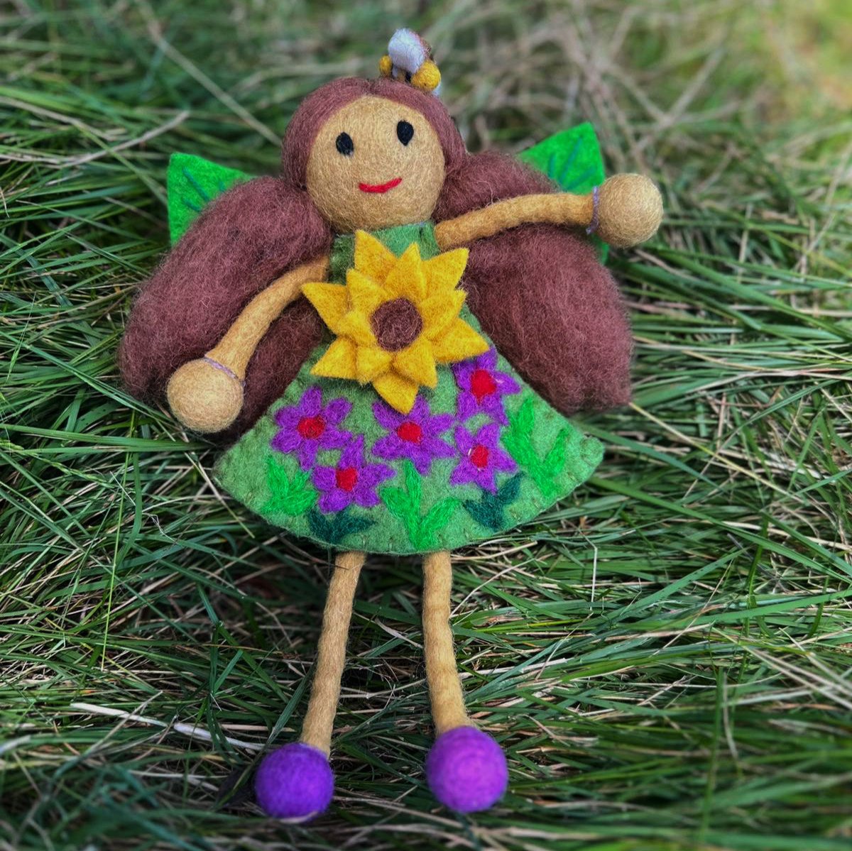Transform your child's room into a magical meadow with Miss Sunflower Faery! Handmade from soft, woolen felt, this whimsical faery is sure to ignite your child's imagination. Let the sunflower petals and magical details transport your little one into a world of enchantment and wonder. Perfect for imaginative play and room decor.