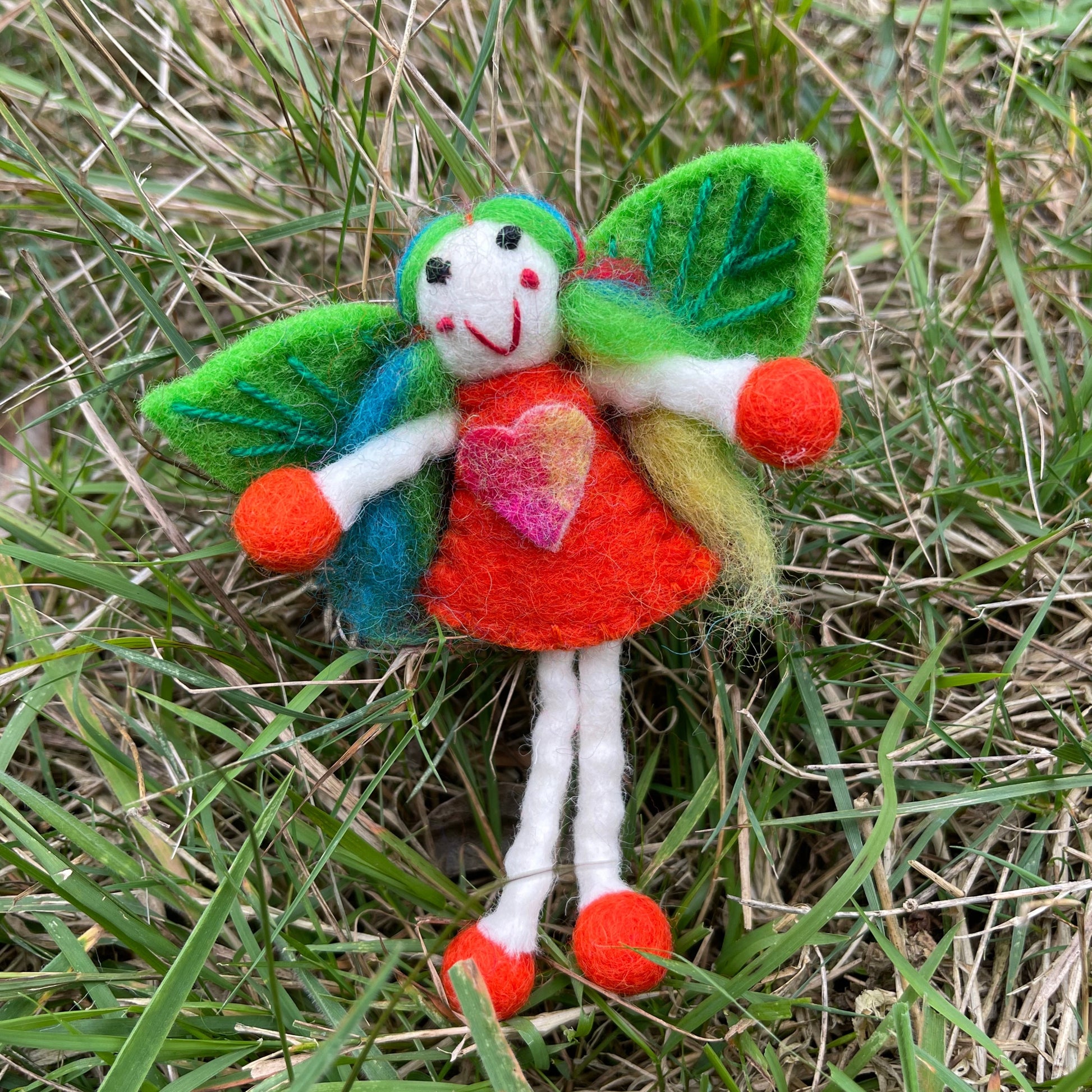 This magical faery has a bright orange dress with a rainbow heart, rainbow hair and magical green leaf wings designed by us! She is aprox 13cm long