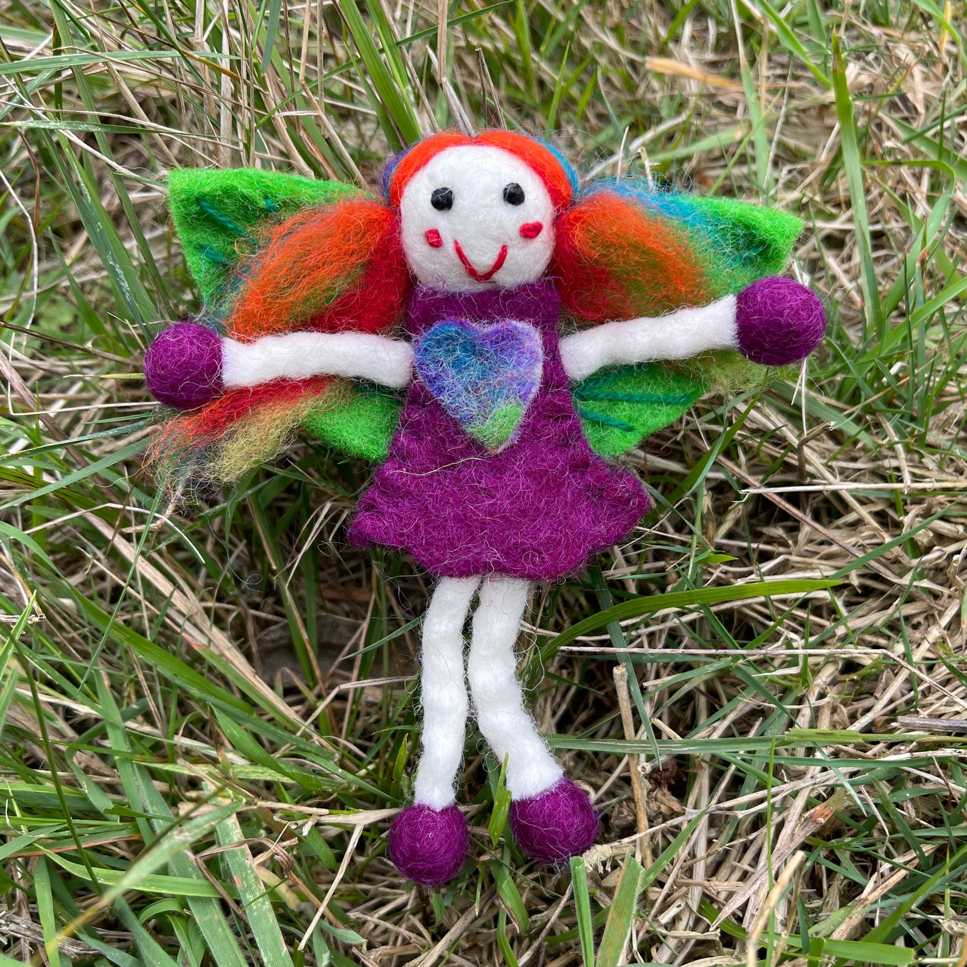 This magical faery has rainbow hair, and a purple dress with a rainbow heart on it, she has magical leaf wings all designed by us! She is aprox 13cm long.
