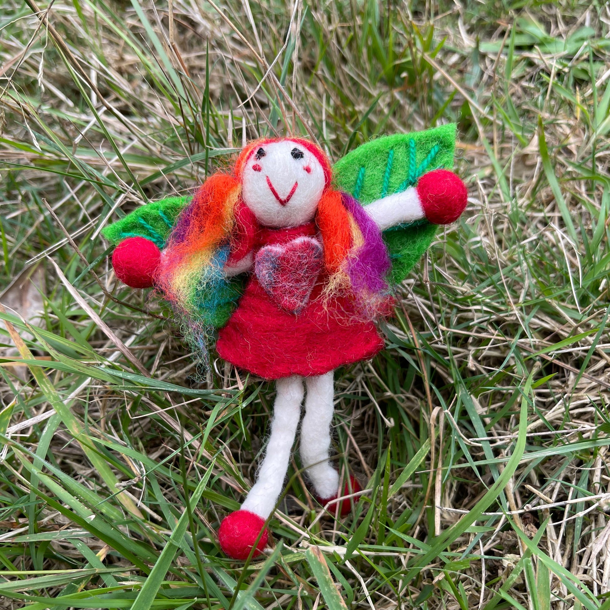 This magical faery has a red free with a rainbow heart, rainbow hair and magical green leaf wings all designed by us! She is aprox 13cm long
