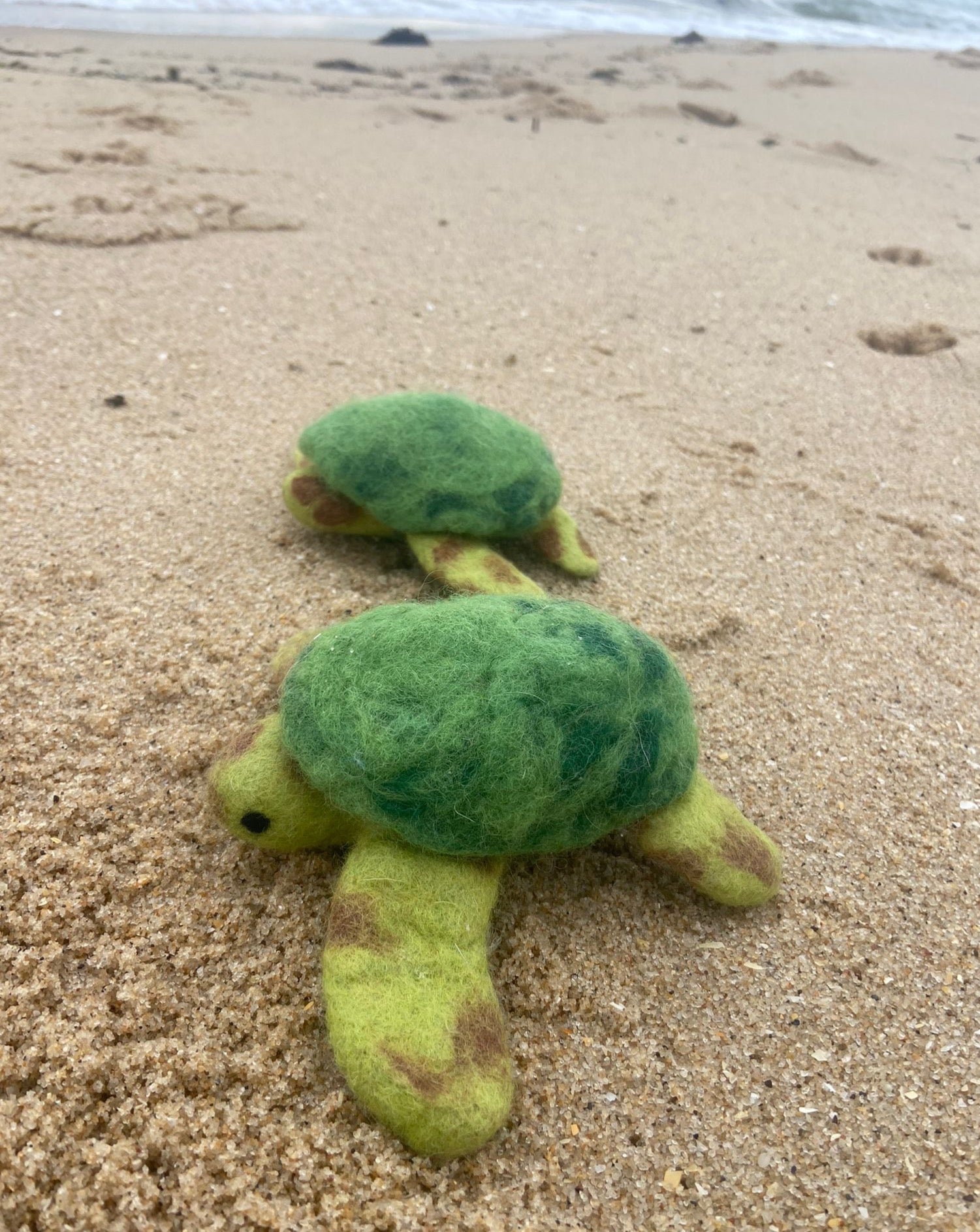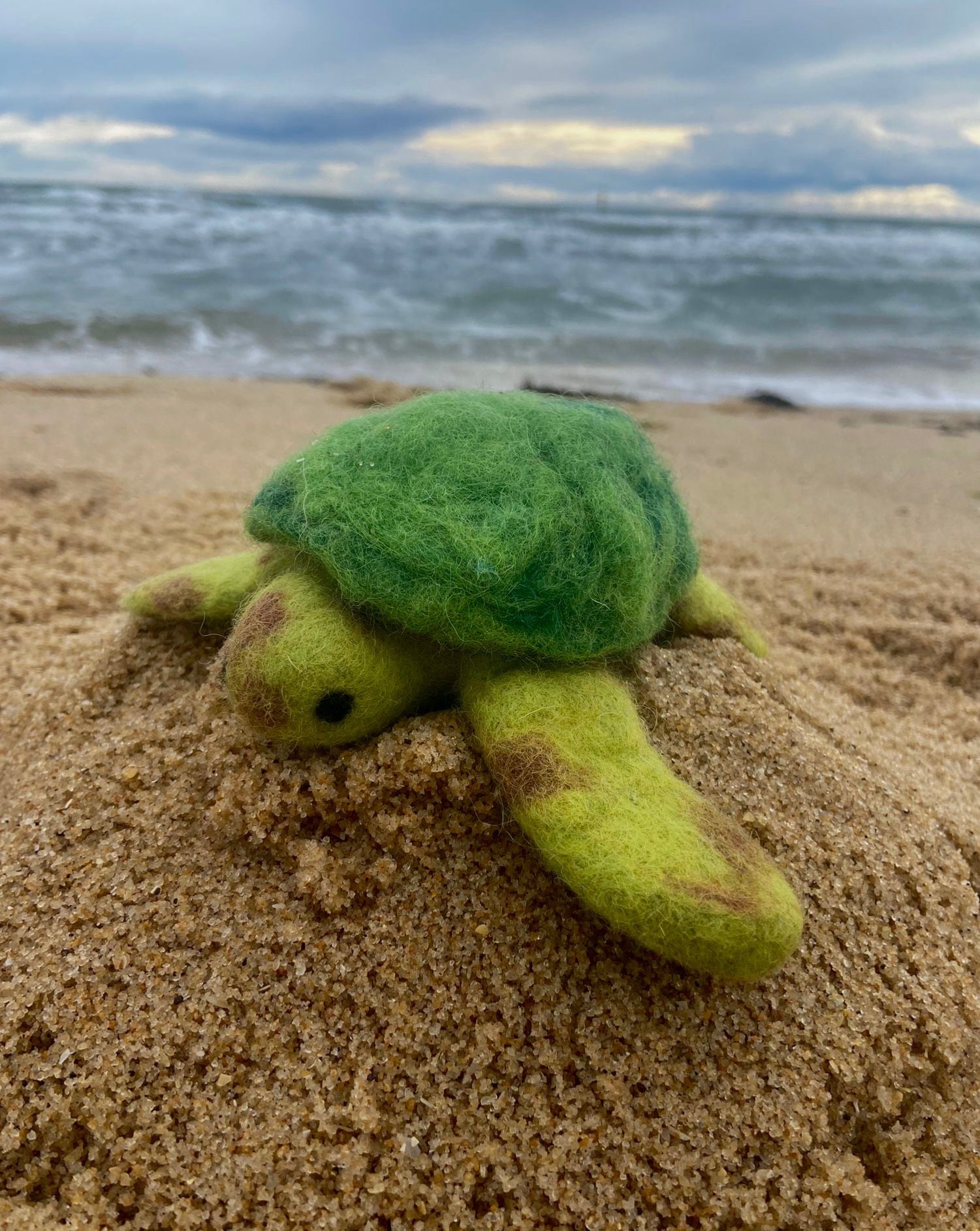 This adorable sea turtle has traveled the oceans far and deep and now its time to rest on the warm sands. This turtle is aprox 15cm long and 13cm wide, it has 4 adorable flippers and a beautiful green shell.