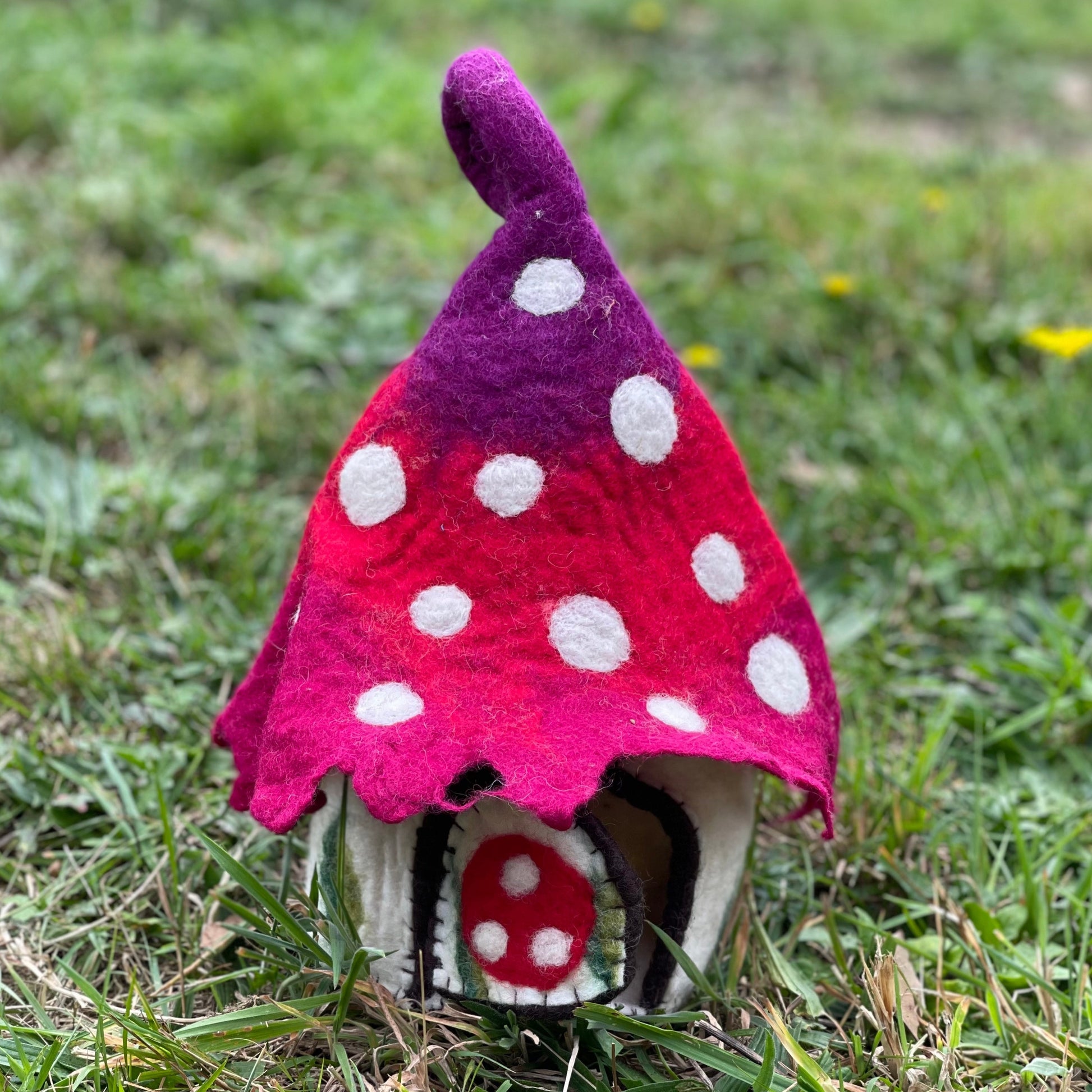 This magical faery home is the perfect partner to any of our faeries, elves or gnomes, it has a door that opens and closes, a fitted roof that does not come of. It is aprox 40cm high by 25cm wide.