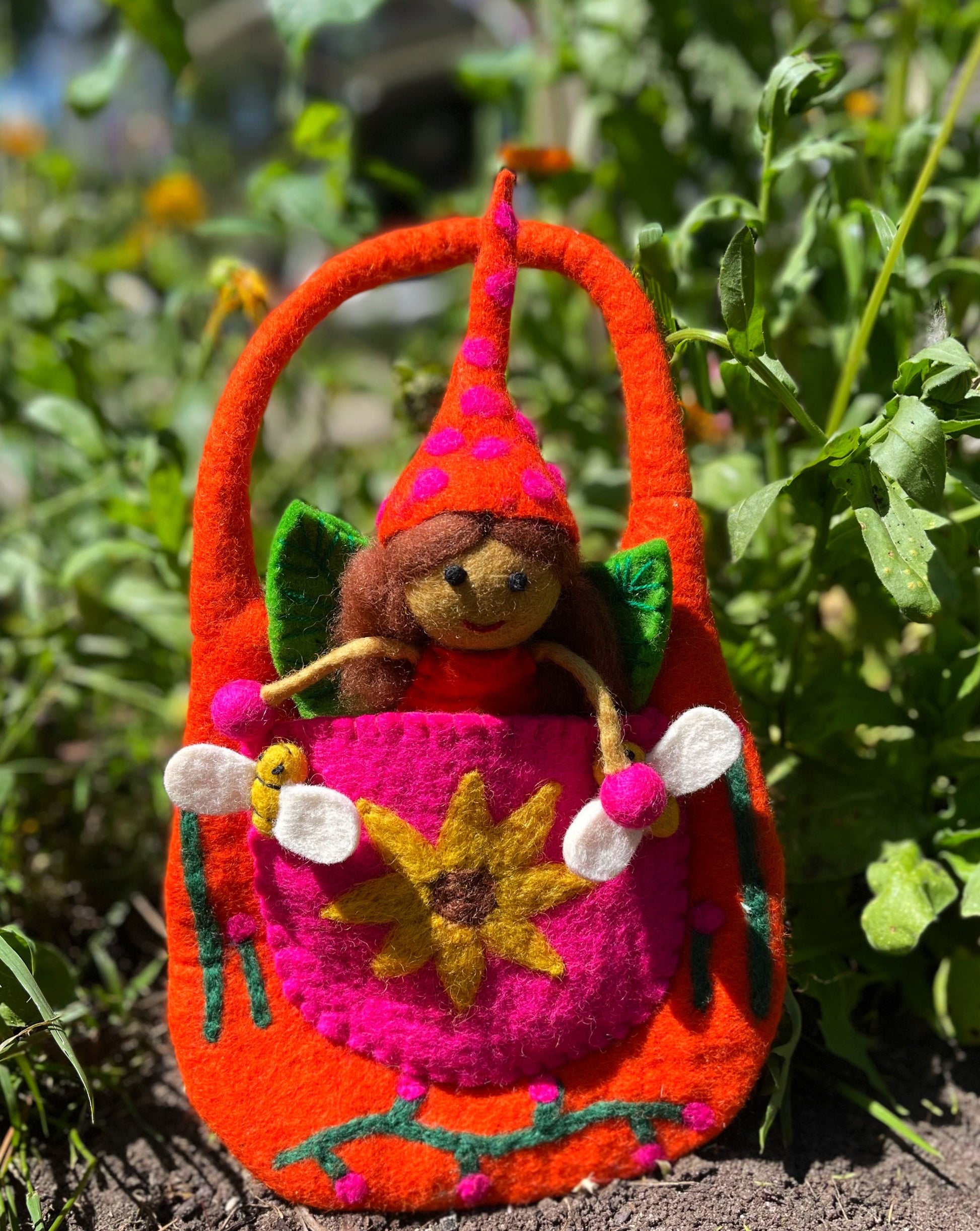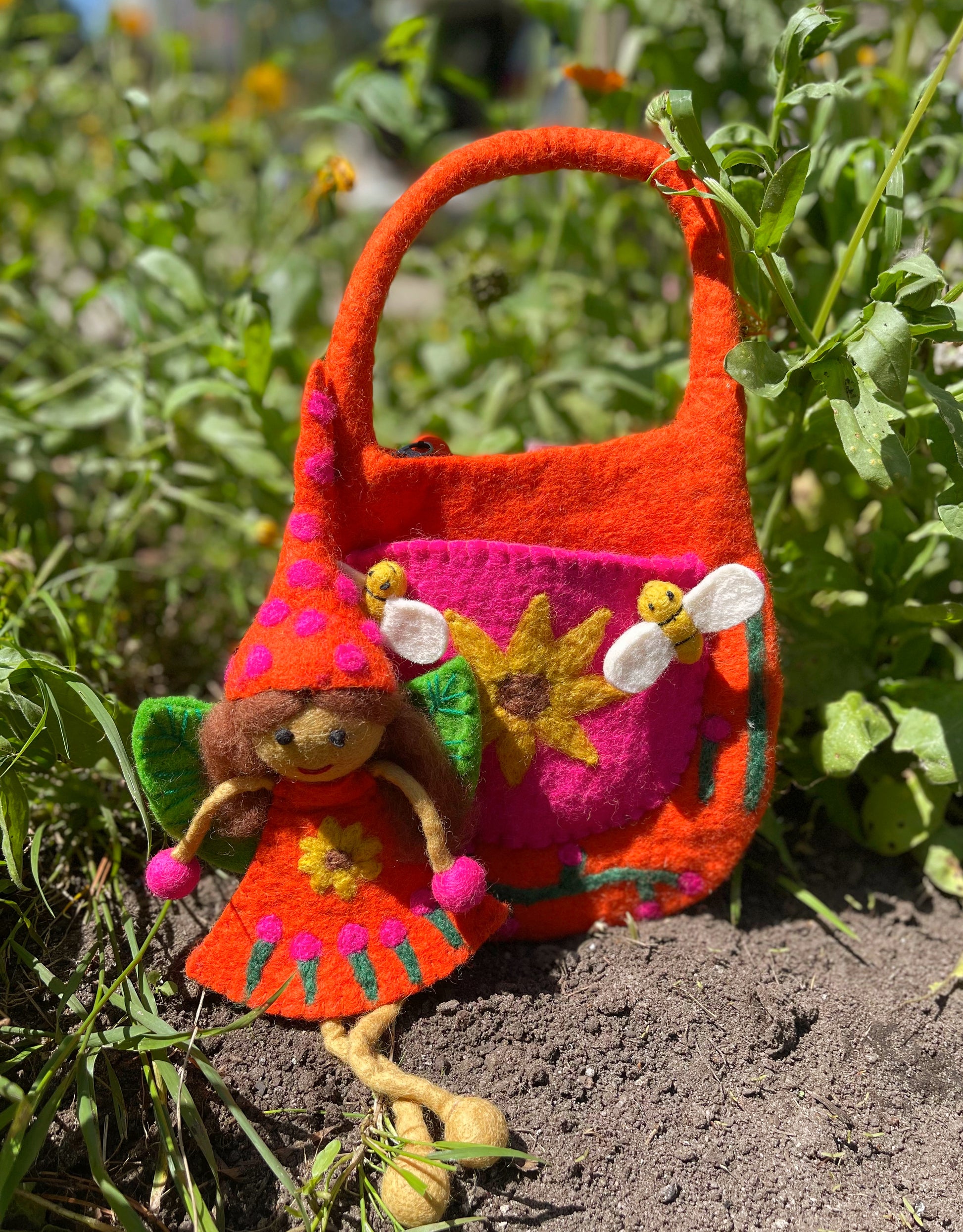 This magical bag comes with its very own solstice faery that sits in the front pocket. The bag is adorned with buzzing bees and magical needle felted sunflowers. It as a pocket in the front and fully lined space in the middle that is opened and closed with a zipper!