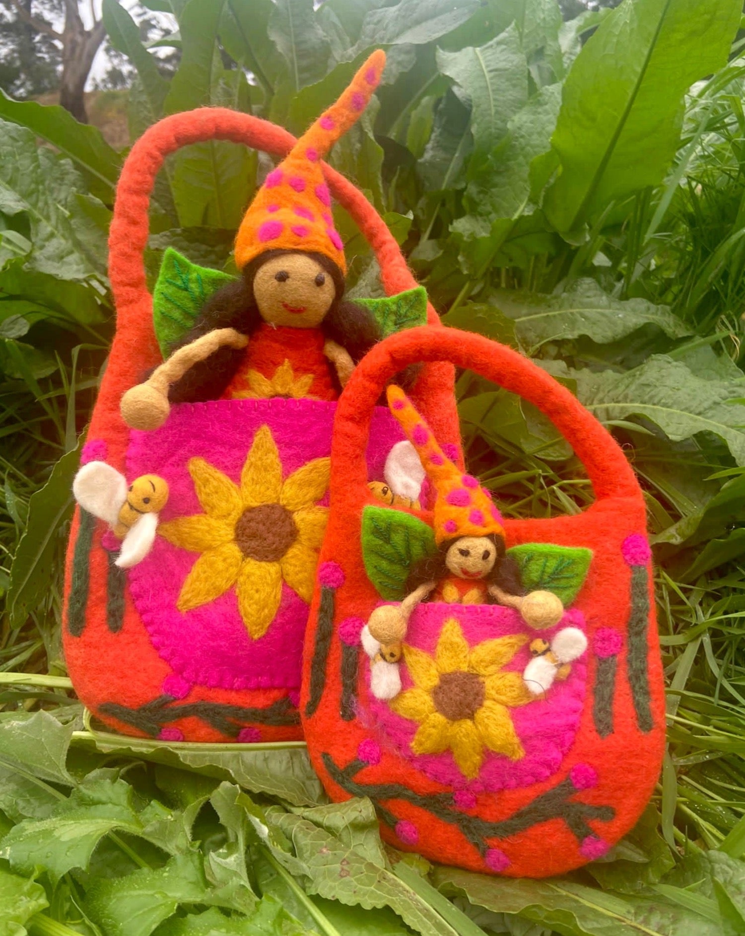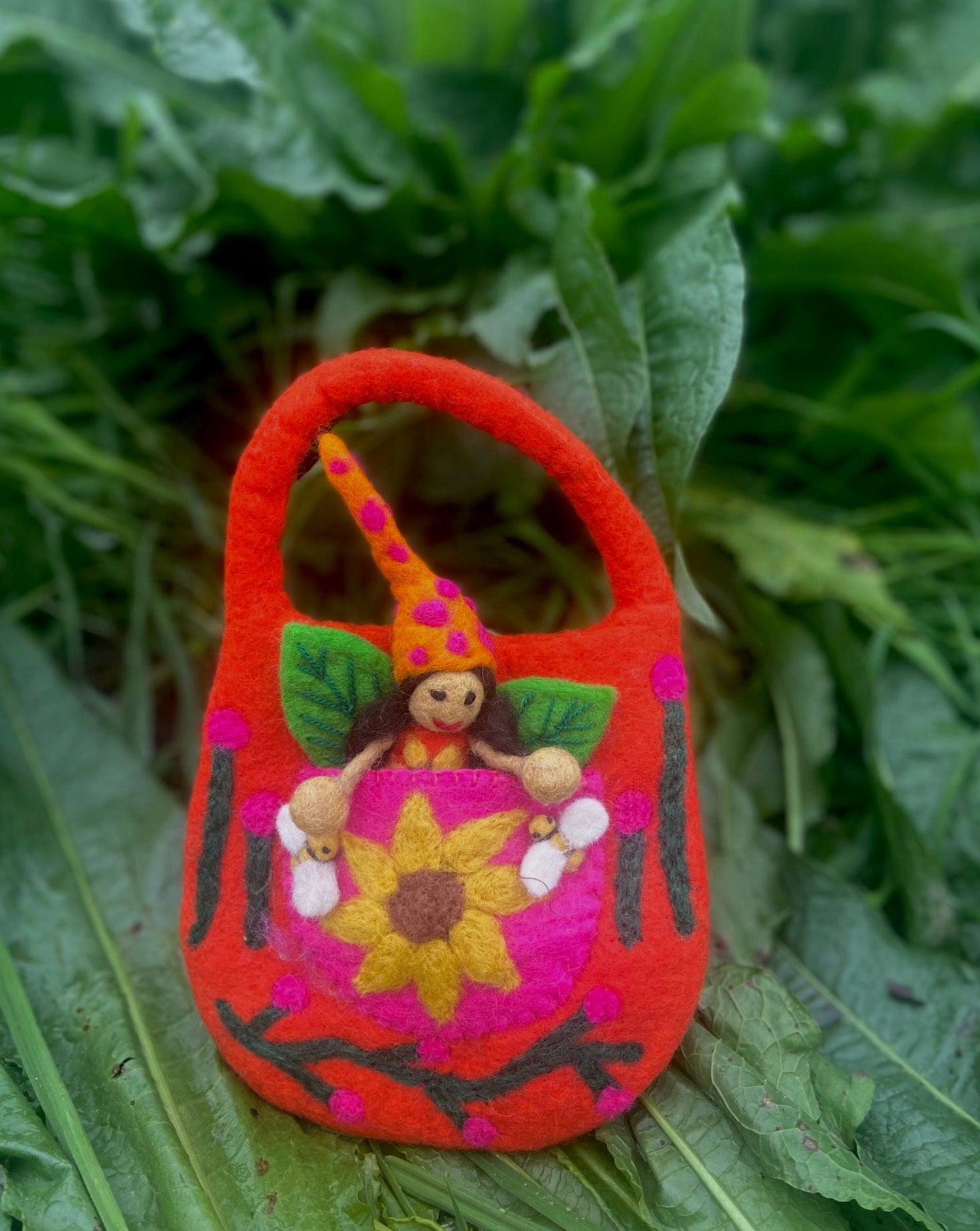 This magical bag comes with its very own solstice faery that sits happily in the front pocket. It is adorned with buzzing bees and needle felted sunflowers. It has a pocket in the front and is fully lined inside the bag tat opens and closes with a zipper.