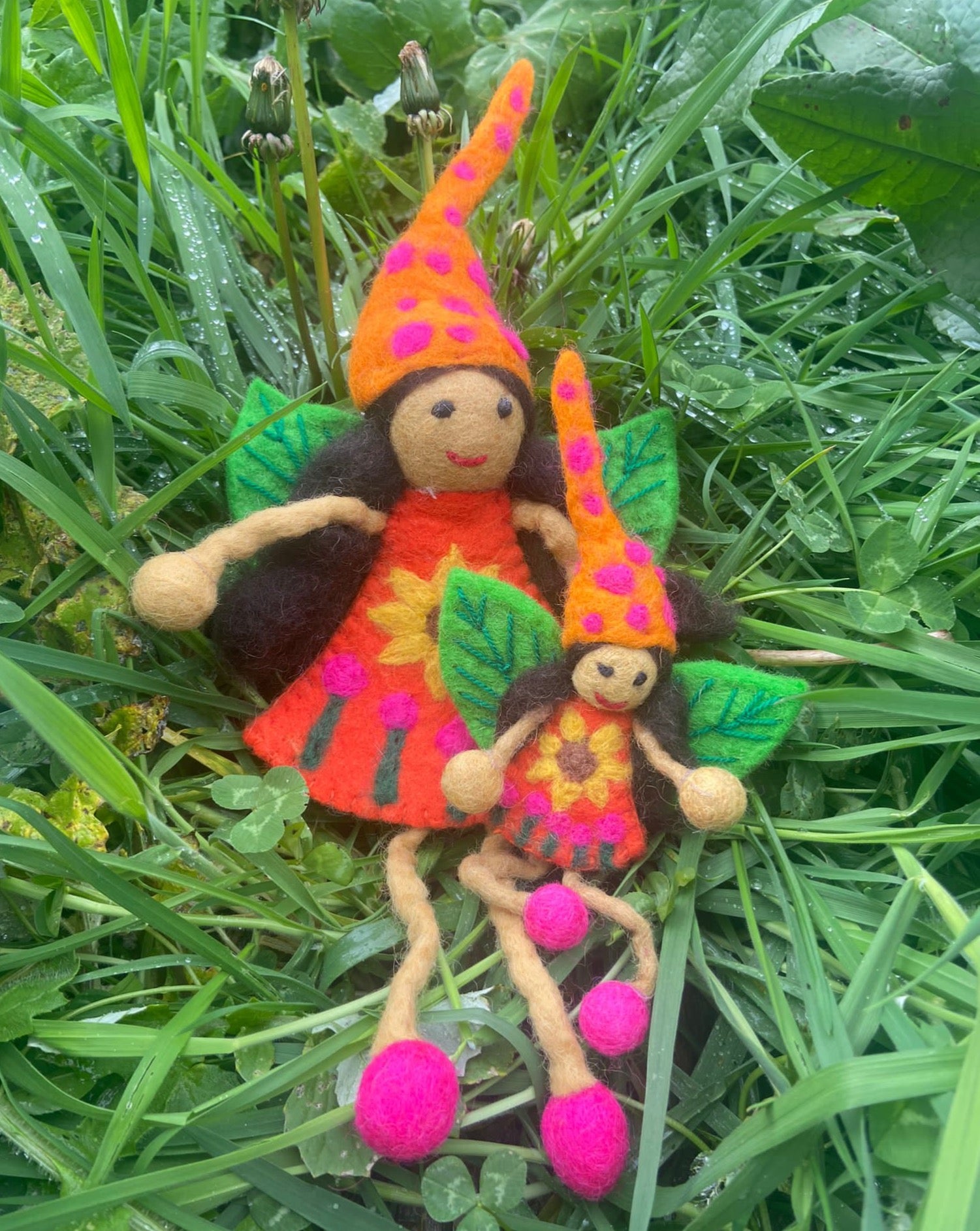 This magical Solstice faery is the bringer of abundance, laughter and new beginnings. She comes adorned with a needle felted sunflower, hot pink blooming buds a magical elfin hat and our trademark leaf faery wings.