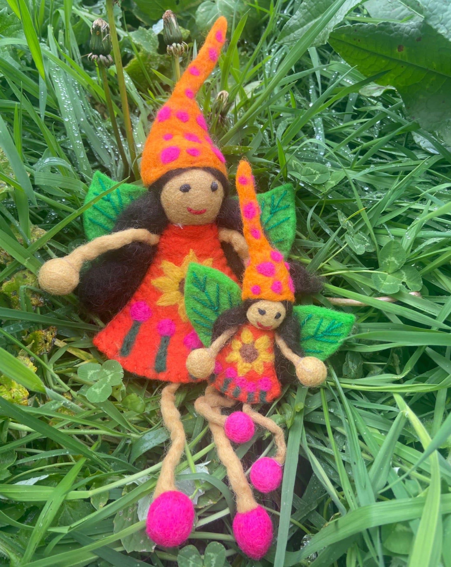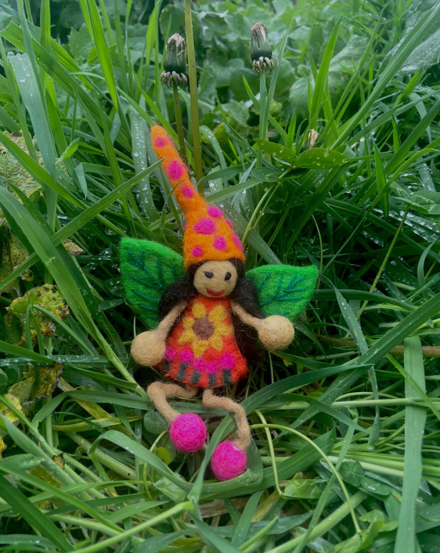 This magical Solstice faery is the faery of Abundance, laughter and new beginnings. She comes adorned with a needle felted sunflower on her dress with hot pink blooming flowers, an adorable elfin hat and our trademark leaf wings.