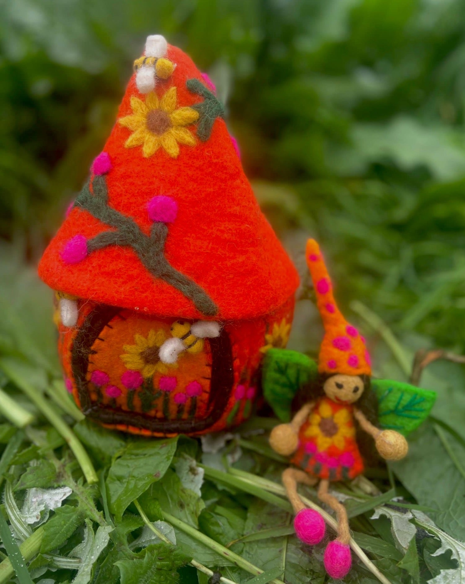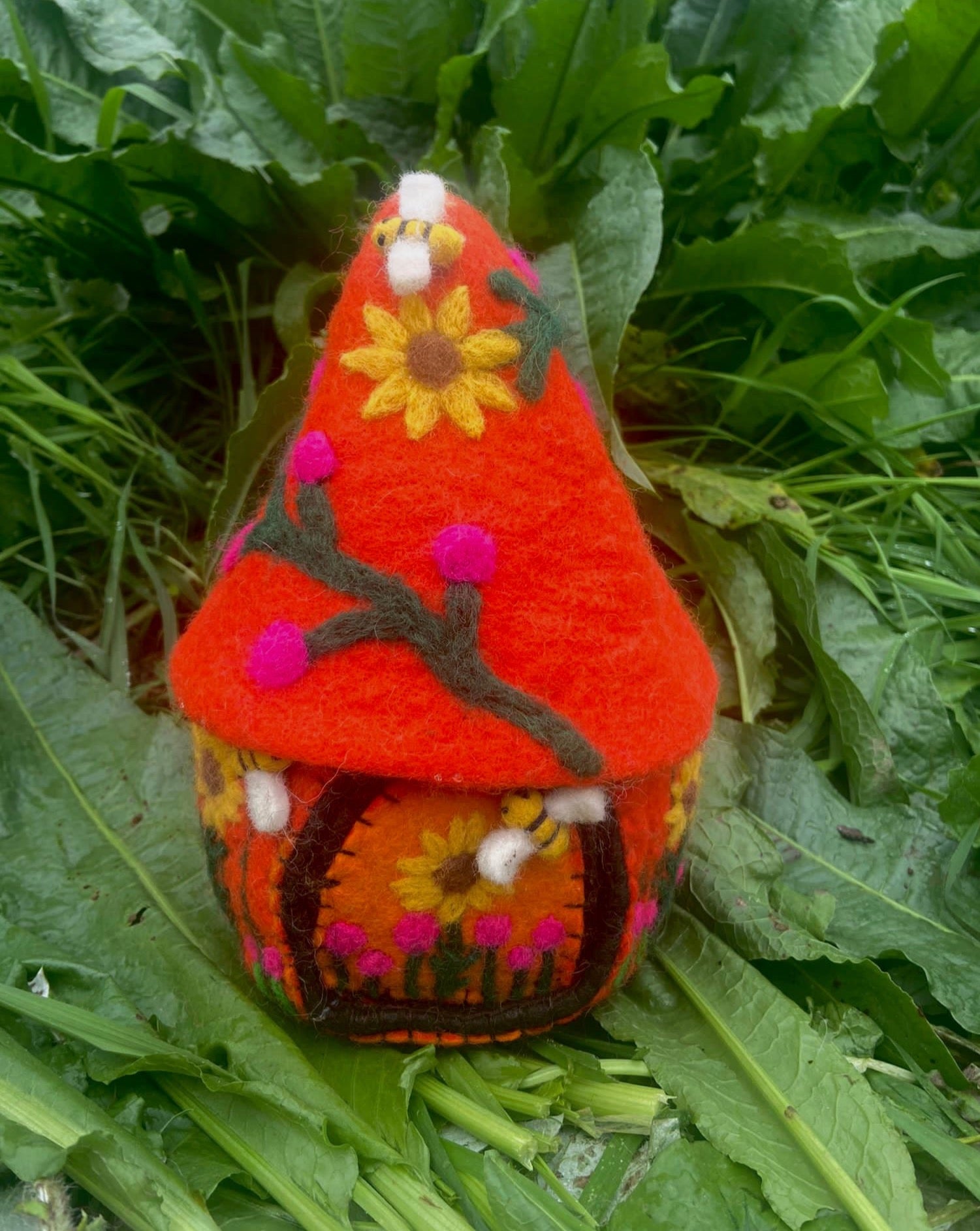 When the Sun is at its most highest point in the sky, and there is more daylight than moonlight, its time for busy solstice faeries to come together at their favourite place in the forest were the Solstice faery home resides. This home is a place for celebration, high teas, magical feasts and lots of faery dancing. This magical home comes adorned with buzzing bees, needle felted sunflowers, hot pink blooming buds and a door that opens and closes. This home also has a roof that can be removed.