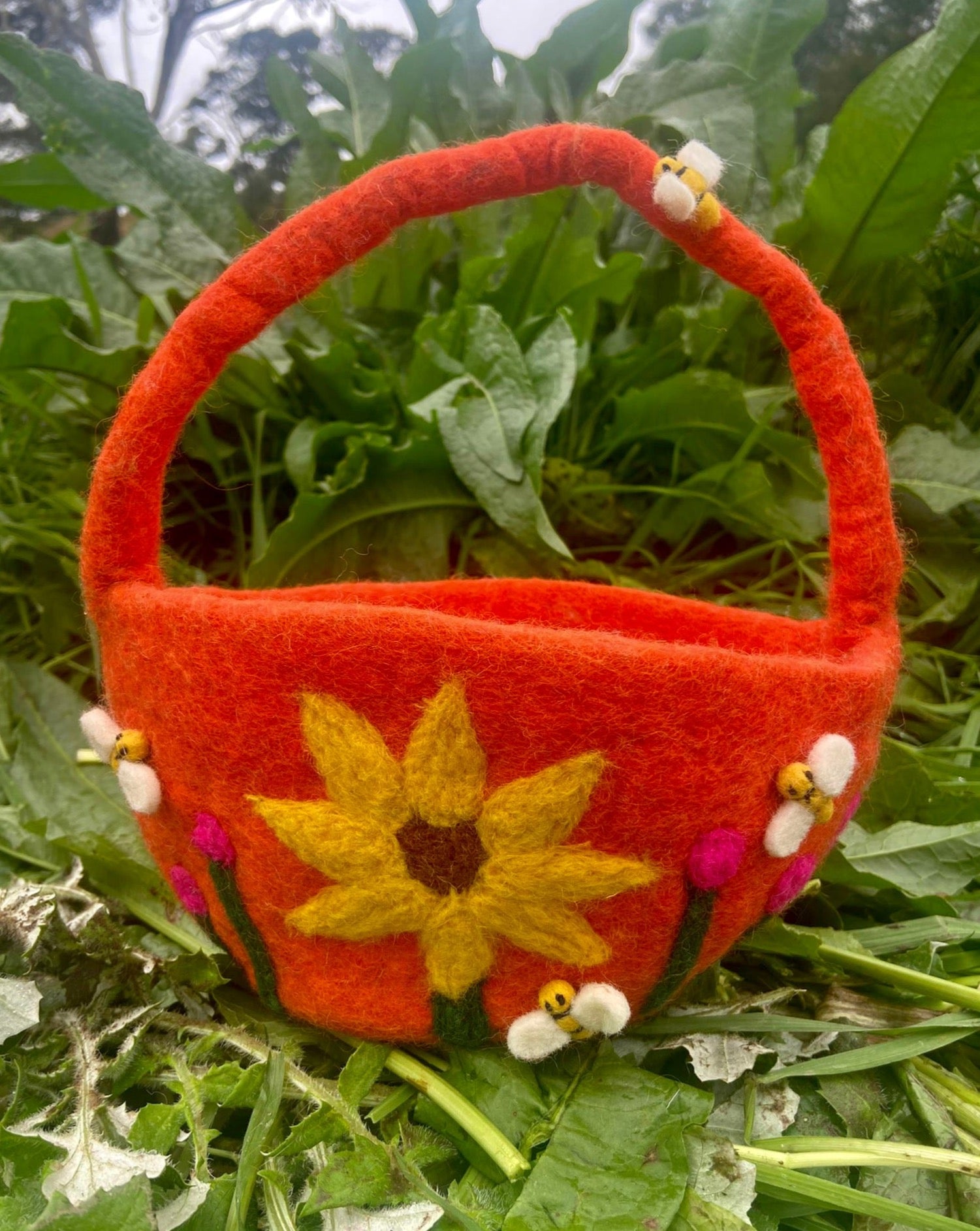This magical foraging basket is ready to be taken on an adventure, out in the woods or down the local park to see what magical finds we can found! This basket is adorned with bees, needle felted sunflowers and pink buds.