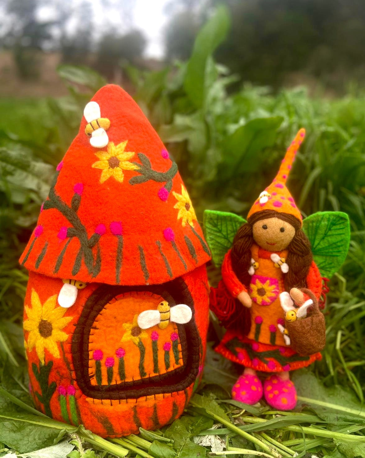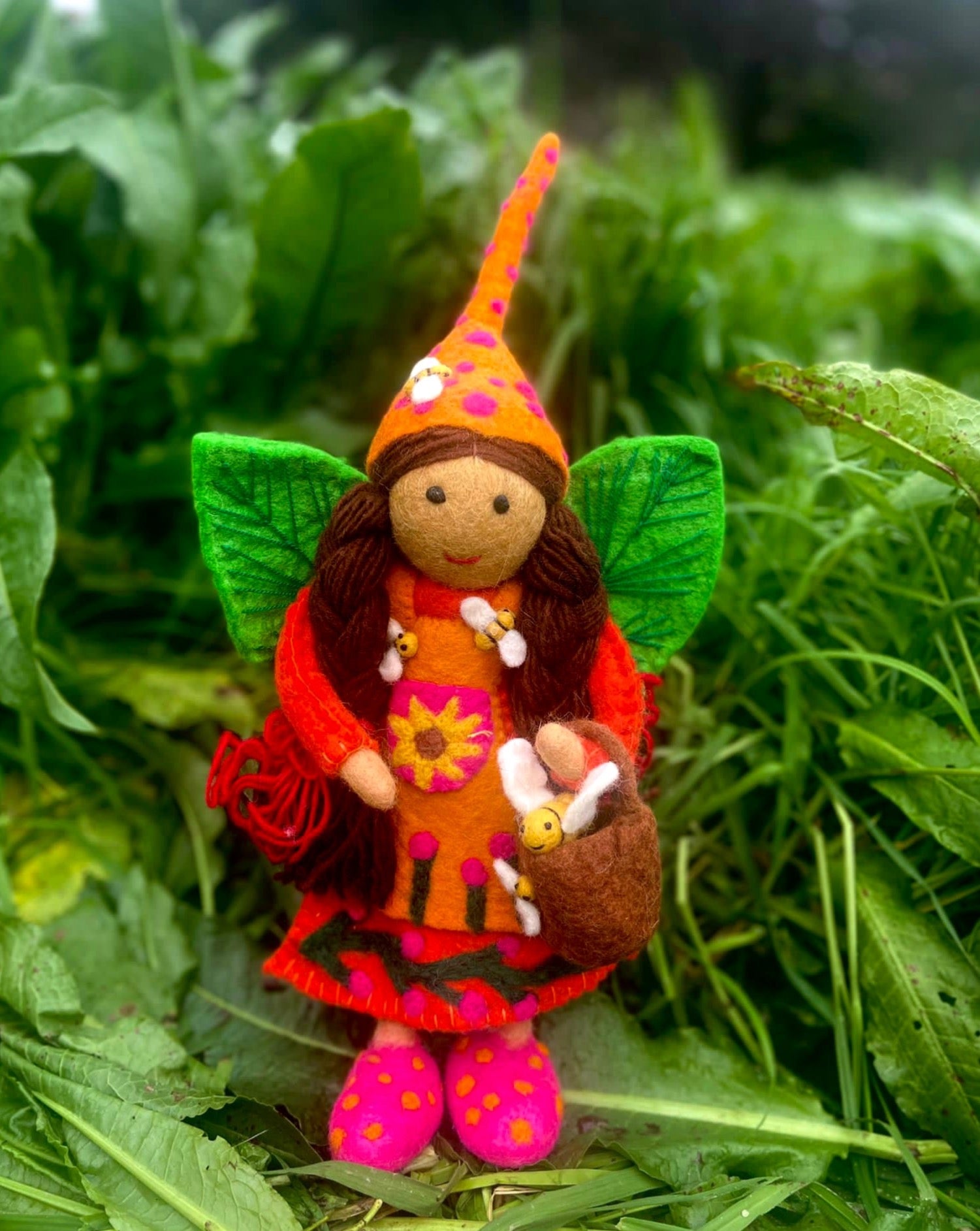 Wandering through the summer fields of the Faery Forest, the Solstice Faery comes with gifts of bees in her magical basket. She is the Forest faery of light, the bringer of abundance, laughter and new beginnings. She comes adorned with bees, and she wears an apron with a needle felted sunflower on its front pocket, bright pink blooming buds, adorable shoes and a elfin hat with a travelling bee. She also comes with her magical basket filled with gifts of bees. The Forest faeries also come in their very own box, which makes them into a very magical gift.