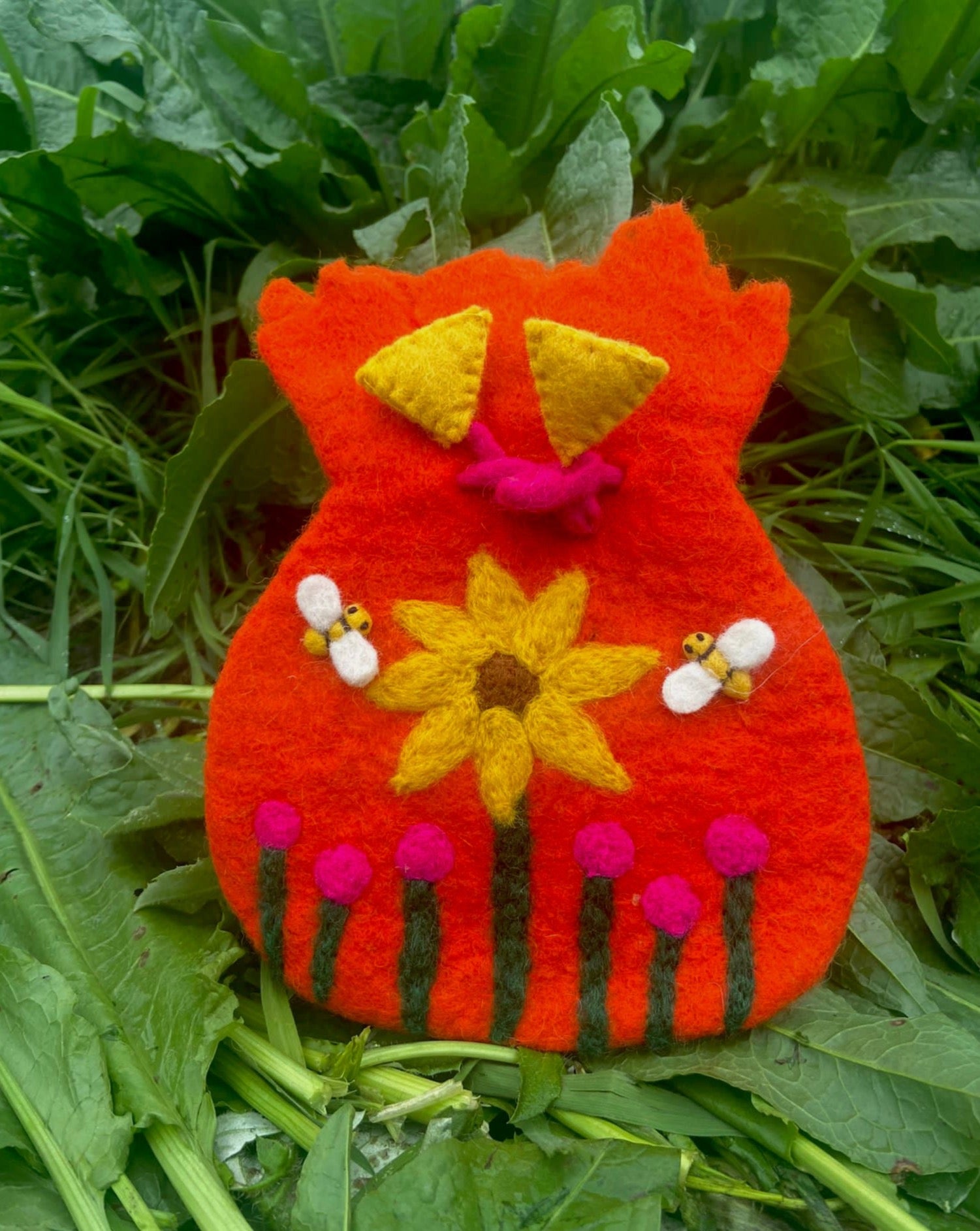 This magical potion pouch has been created in the heart of the faery forest, it is the perfect item to pop all your magical potion ingredients in and take on many magical adventures. It is adorned with bees, needle felted sunflowers and hot pink flower buds, and is enclosed with a hot pink drawstring.
