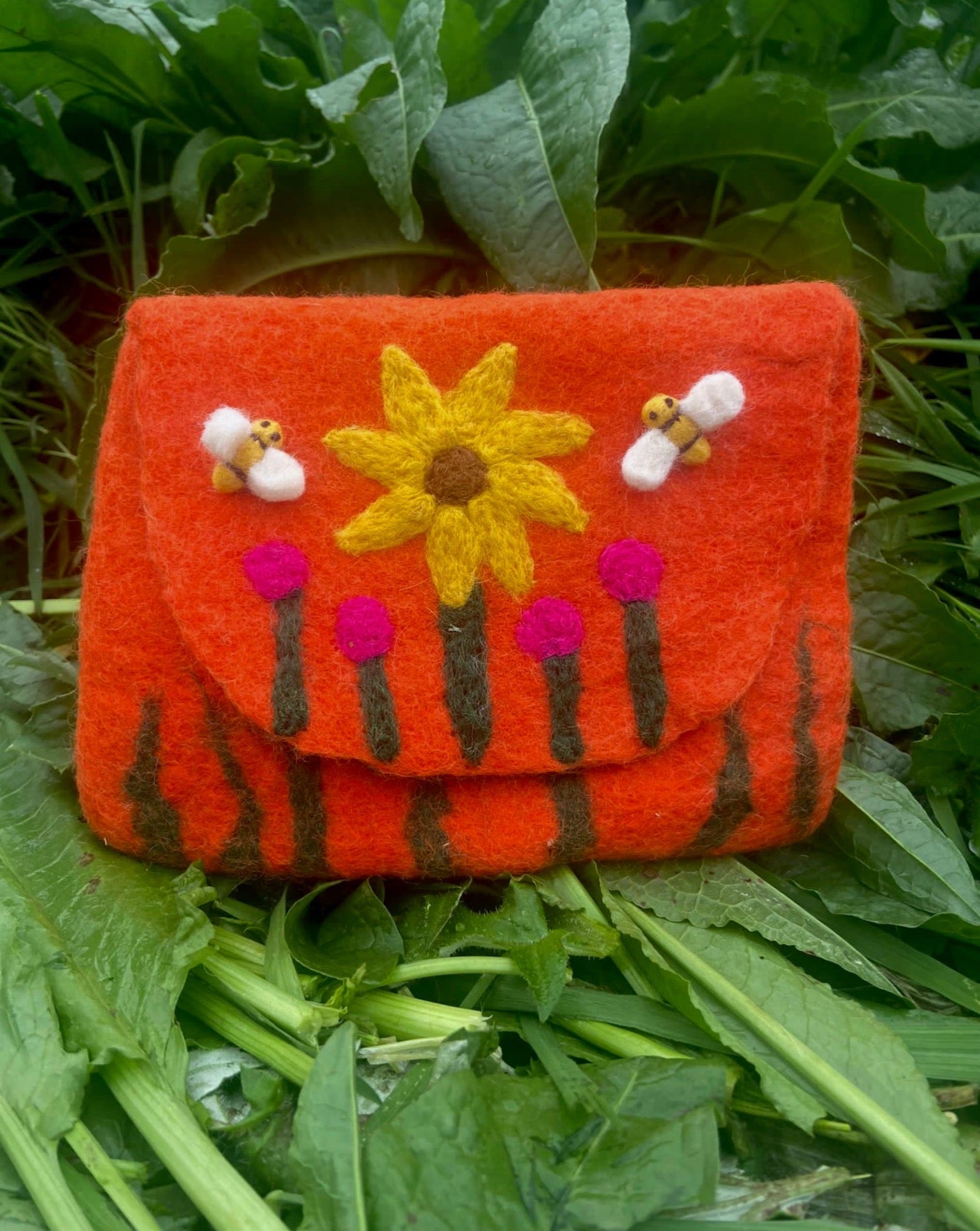 Adorned with bees and needle felted sunflowers and hot pink flower buds, its purse comes fully lined and closes with a zipper.