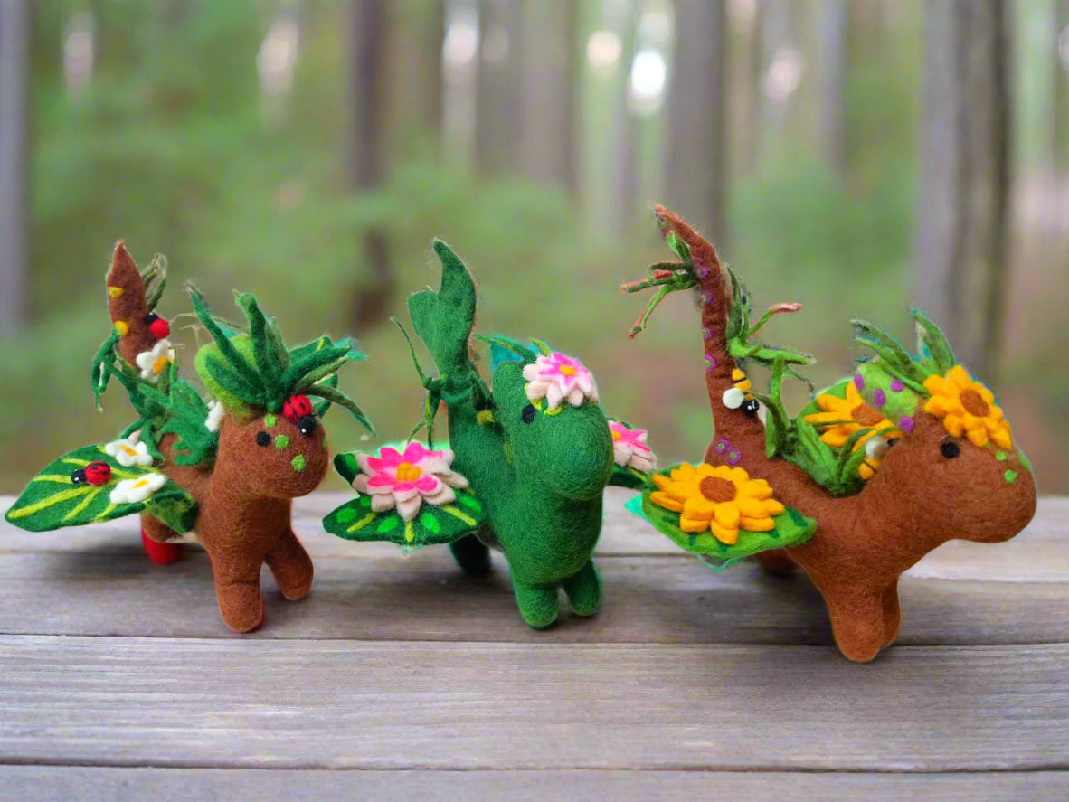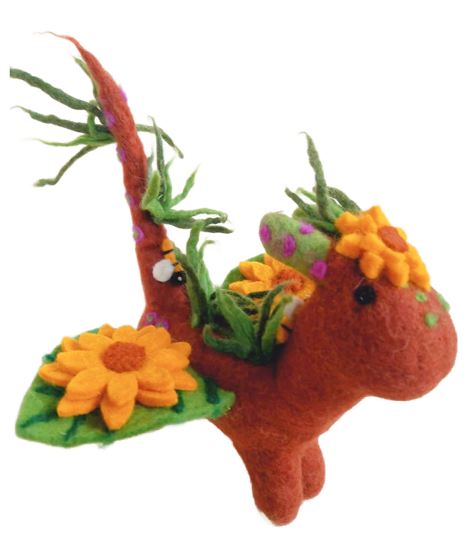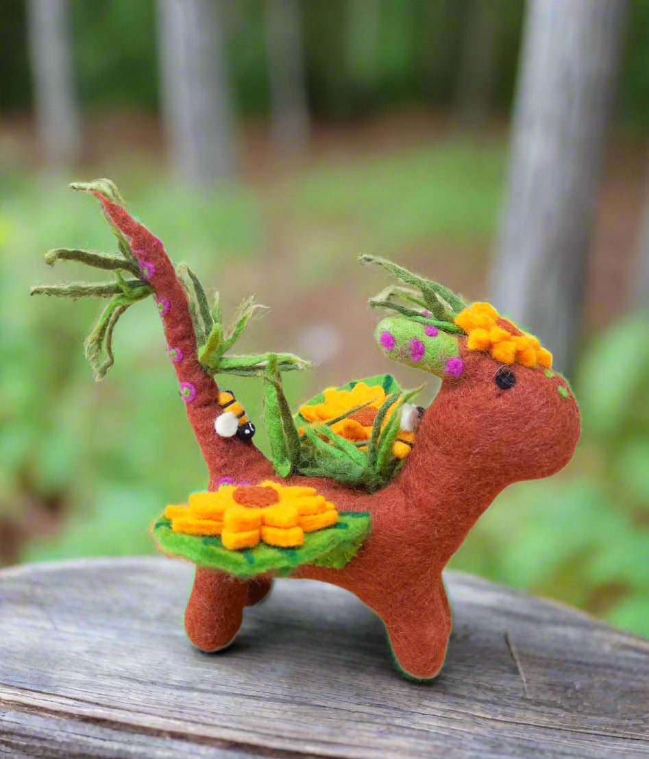 Bring a touch of whimsy to your space with this Sunflower Dragon, hand-felted with care. Adorned with cheerful sunflowers, buzzing bees, and wild grasses, it carries the magical lore of sunflowers wherever it goes. Perfect for brightening your day with a playful, nature-inspired charm.
