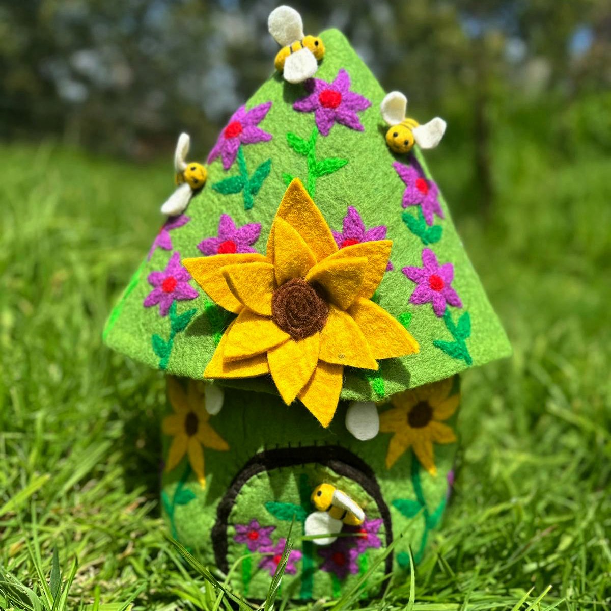 Transform your space with our Sunflower Faeryhome-Large! Handmade with love, its magikal faery bees bring joy to any space. The intricate needle felted flowers and fixed woolen felt roof make it durable in the summer breeze. Invite the faeries and add a touch of enchantment to your magikal sanctuary!