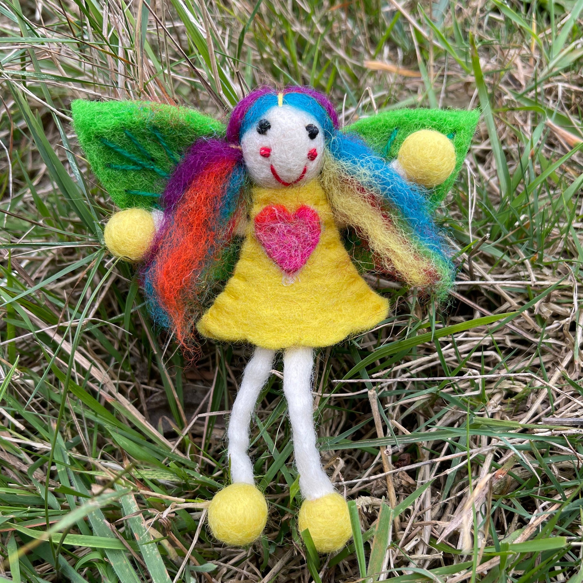 This magical faery has rainbow hair, a bright yellow dress with a rainbow heart on it. she has magical green leaf wings all designed by us! She is aprox 13cm long